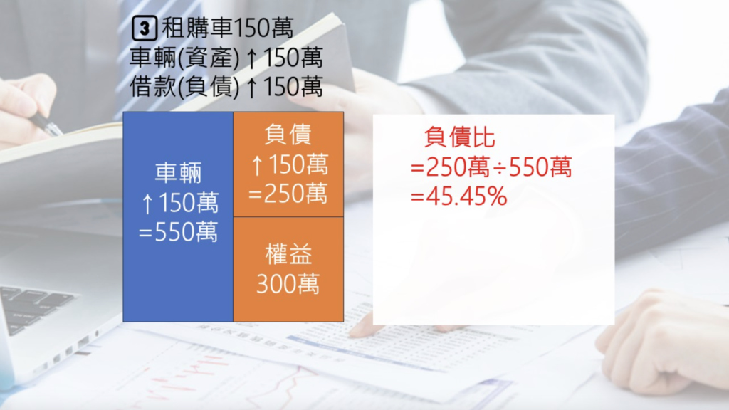如果公司負債比越高,銀行也會認為放款給你的風險越高,如果你對「租購車」有興趣,請參考EP.65 【公司租賃車能節稅?】租還是買?掛誰名下?租車節稅的5個關鍵問題!破解稅務迷思,避開補稅風險!