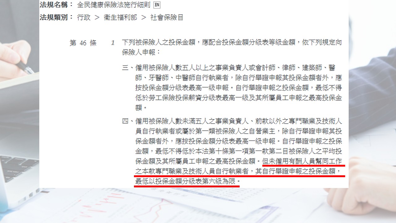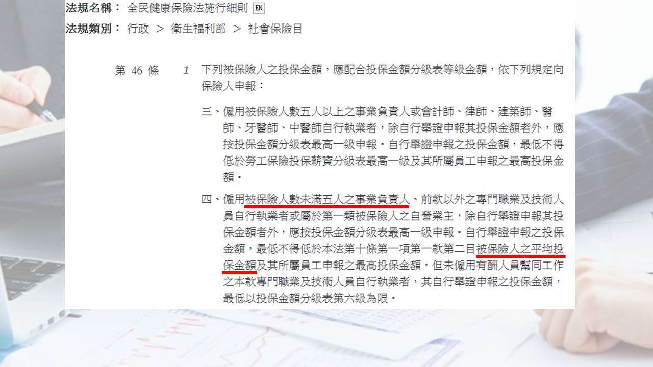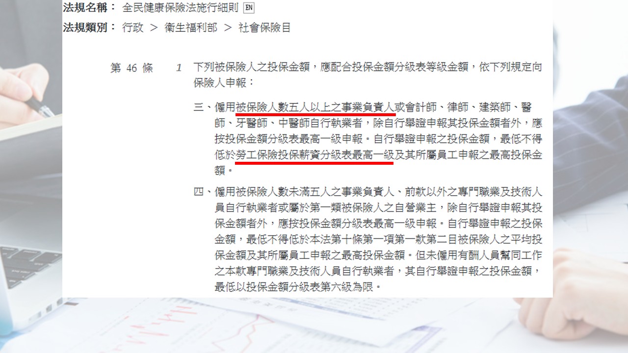 對於員工未滿 5 人的公司(包含一人公司),負責人的健保投保金額,有一個法定的最低下限。