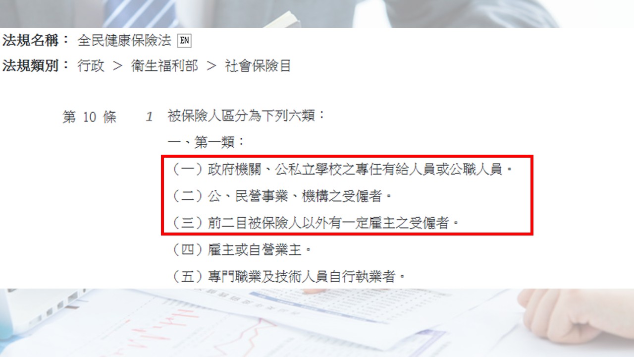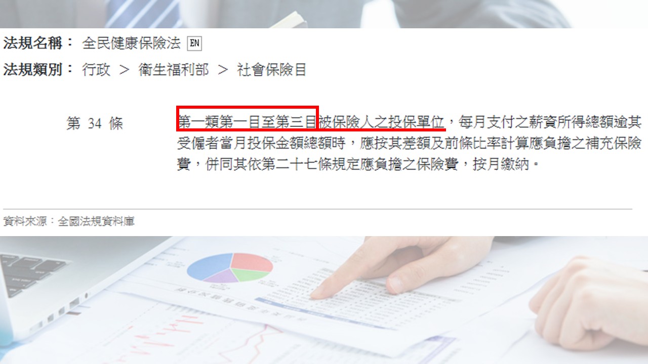 這邊就是重點囉!根據 《全民健康保險法》第 34 條的規定,第一類第一目至第三目被保險人之投保單位,才需要計算繳納補充保費。