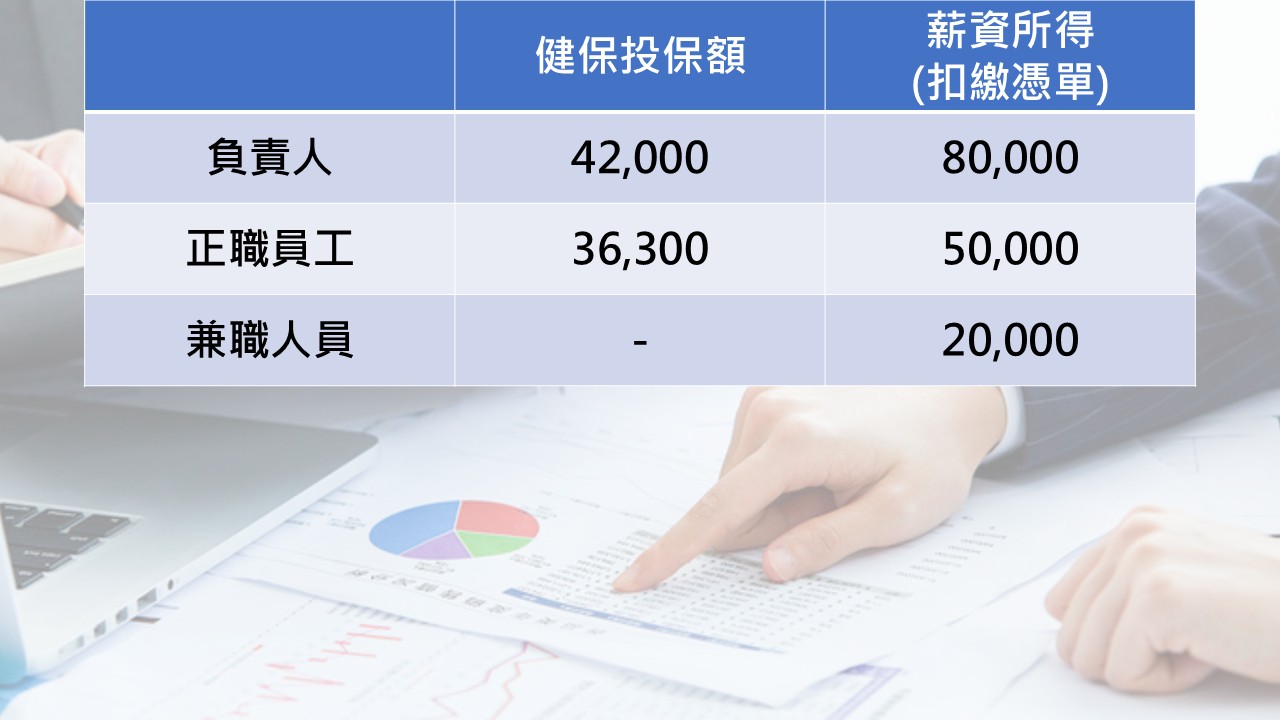 答案是:只能納入正職員工 36,300 。因為負責人跟兼職人員都沒有受僱者健保投保額可以減除,所以他們的健保投保額都不能納入減項來計算。