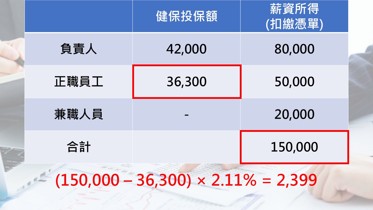 因此,當公司只有負責人一人時,情況就跟剛剛提到的兼職人員類似,由於負責人並非受僱者,自然也就不用計算補充保費了。